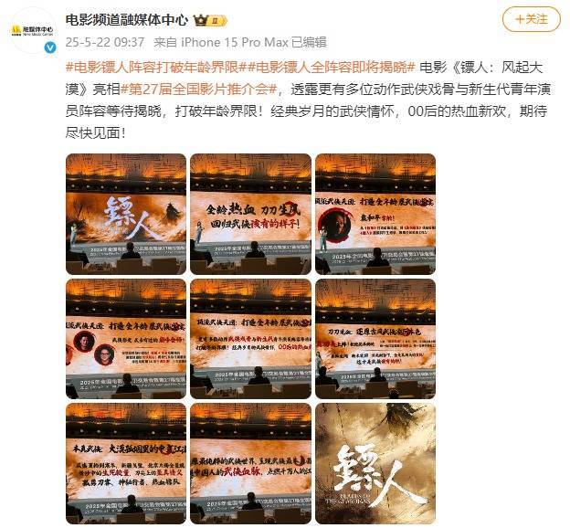 @电影频道融媒体中心写道:电影《镖人:风起大漠》亮相第27届全国影片推介会,透露更有多位动作武侠戏骨与新生代青年演员阵容等待揭晓,打破年龄界限!经典岁月的武侠情怀,00后的热血新欢,期待尽快见面!